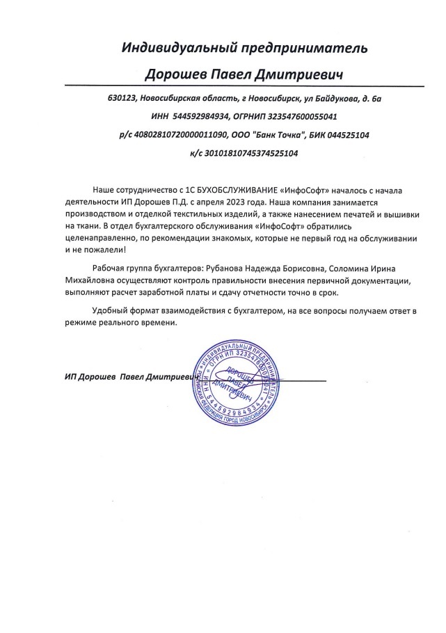 Наше сотрудничество с 1С БУХОСЛУЖИВАНИЕ «ИнфоСофт» началось с начала деятельности ИП Дорошев П. Д. с апреля 2023 года. Наша компания занимается производством и отделкой текстильных изделий, а также нанесением печатей и вышивки на ткани. В отдел бухгалтерского обслуживания «ИнфоСофт» обратились целенаправленно, по рекомендации знакомых, которые не первый год на обслуживании и не пожалели!