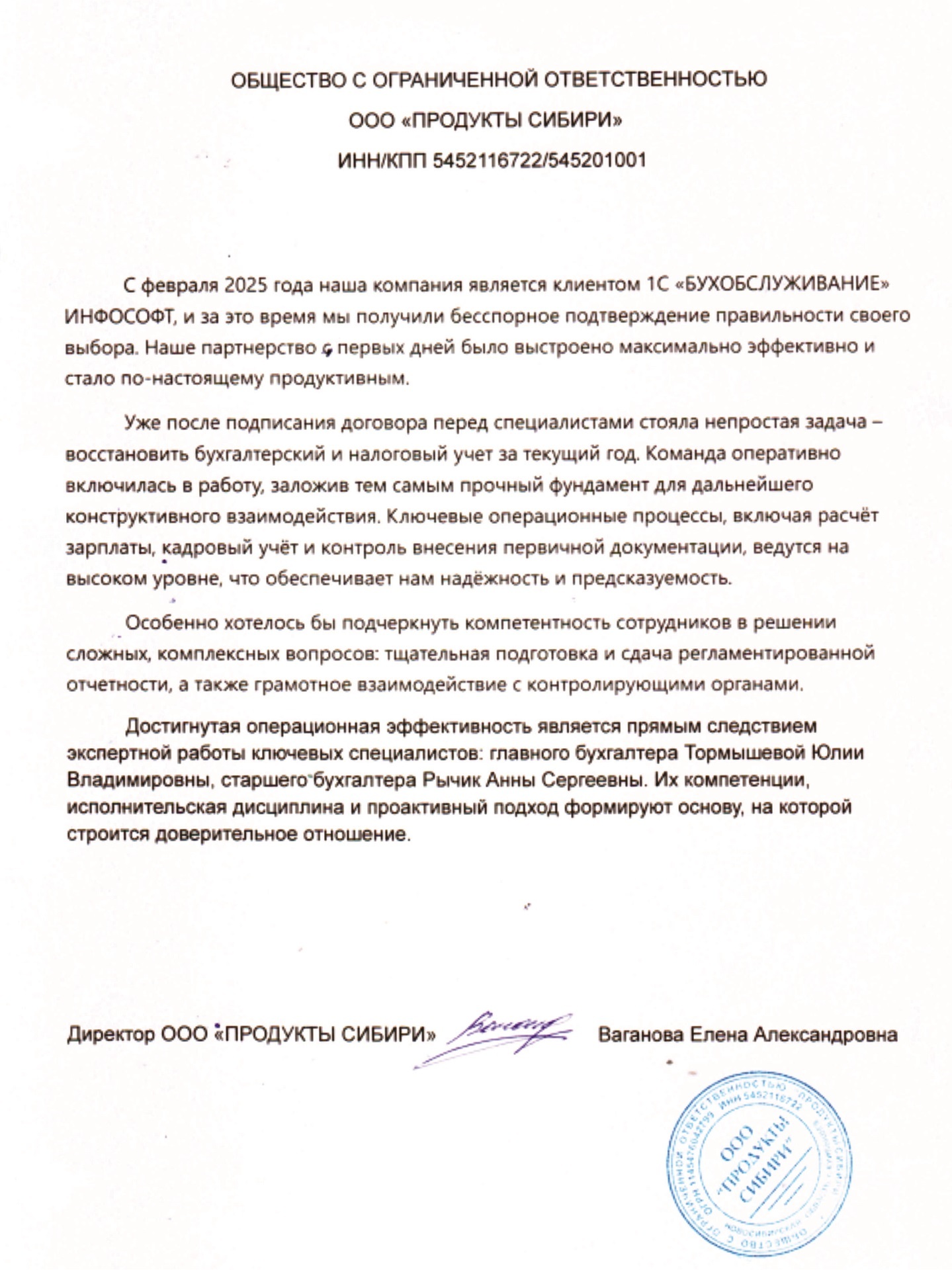С февраля 2025 года наша компания является клиентом «1С:БухОбслуживание» ИнфоСофт, и за это время мы получили бесспорное подтверждение правильности своего выбора. Наше партнерство с первых дней было построено максимально эффективно и стало по-настоящему продуктивным.
