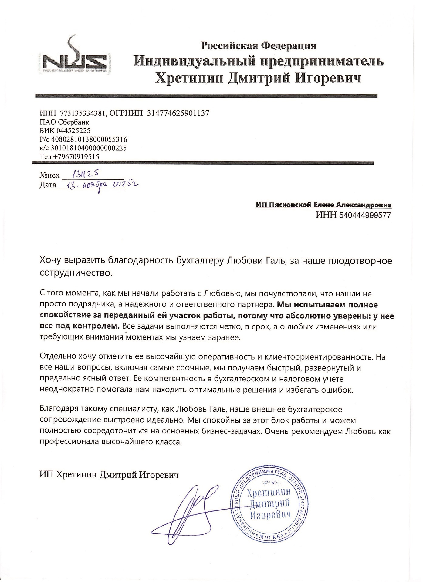 Хочу выразить благодарность бухгалтеру Любови Галь за наше плодотворное сотрудничество.
